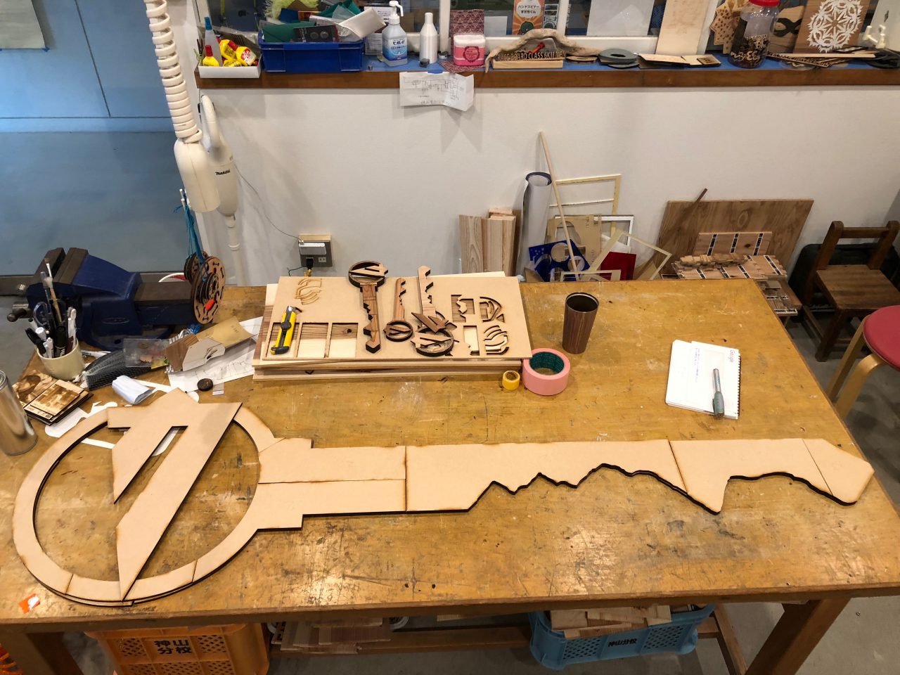 アクリルを使ったりも考えたんですがシンプルに木目を活かすことにしました。大きさは1.7メートルほどになり、成人男性が抱えるとこんなサイズ感です。