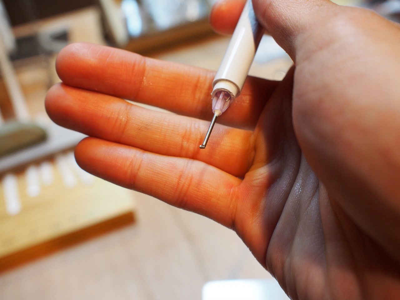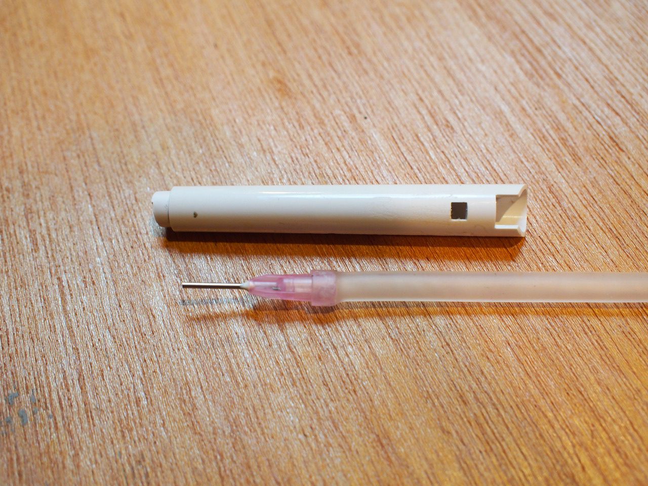 次にポンプにチューブを取り付けて、先端にディスペンサーニードルを取り付けます。根元に出っ張りがあったらやすり落としておきます。