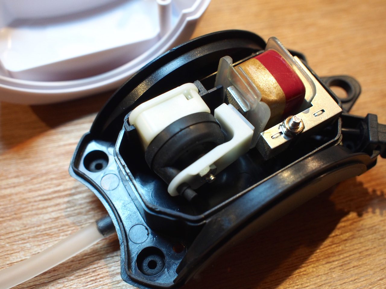 仕組みは恐ろしくシンプルで、60Hz/50Hzの交流をそのままコア入りコイルに流して、ゴムのピストンみたいなのに付いた磁石が極性の変化で左右に振れることで空気を吐き出すというものです。