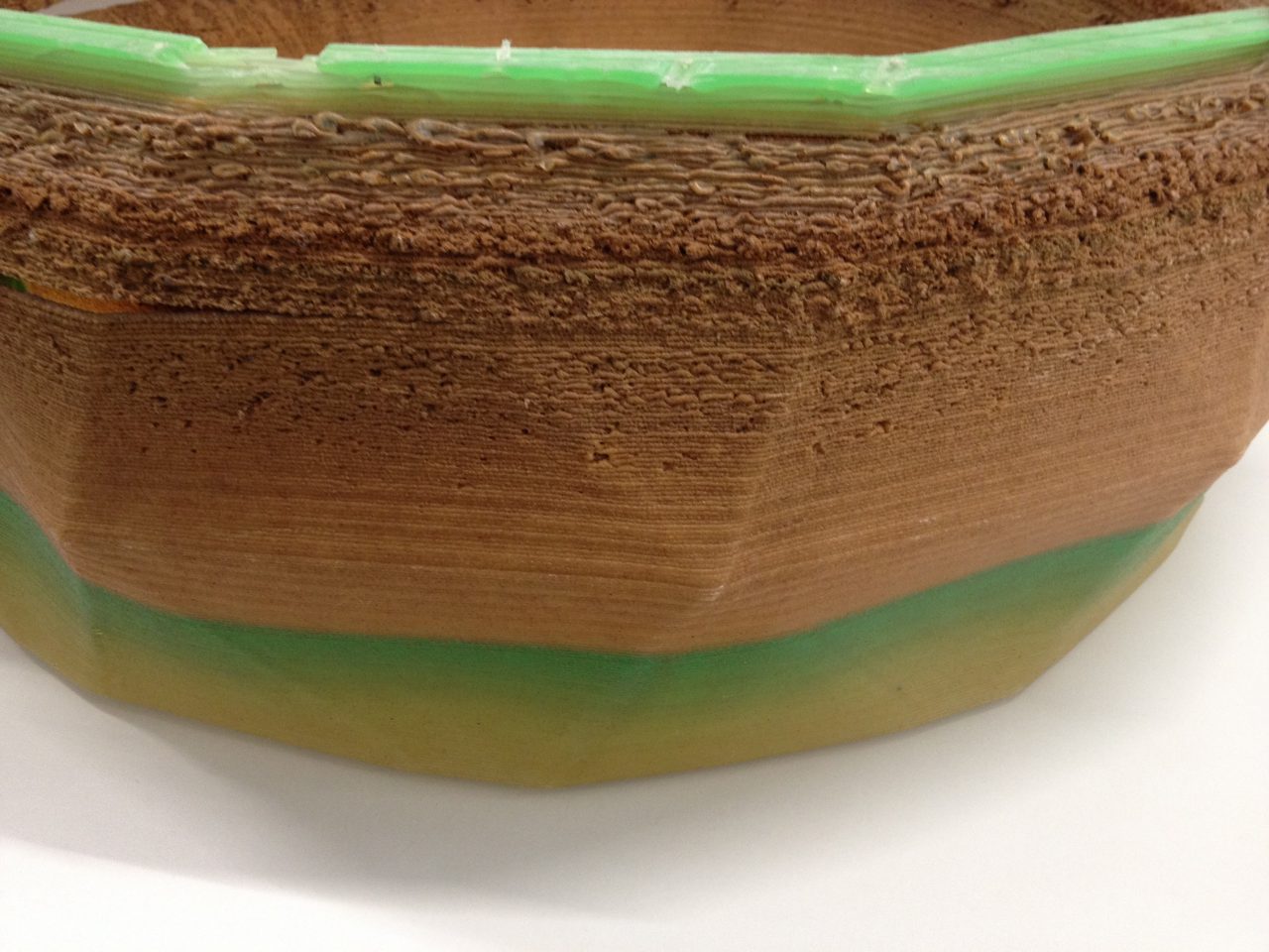 この大きな植木鉢のようなものは、フィラメントのテストだそう。様々な素材に対して20%のリンシードオイル(乾性油)を混ぜて作るそう。この茶色の部分は木材の粉を入れています。杉の粉でもできるのでしょうかー?