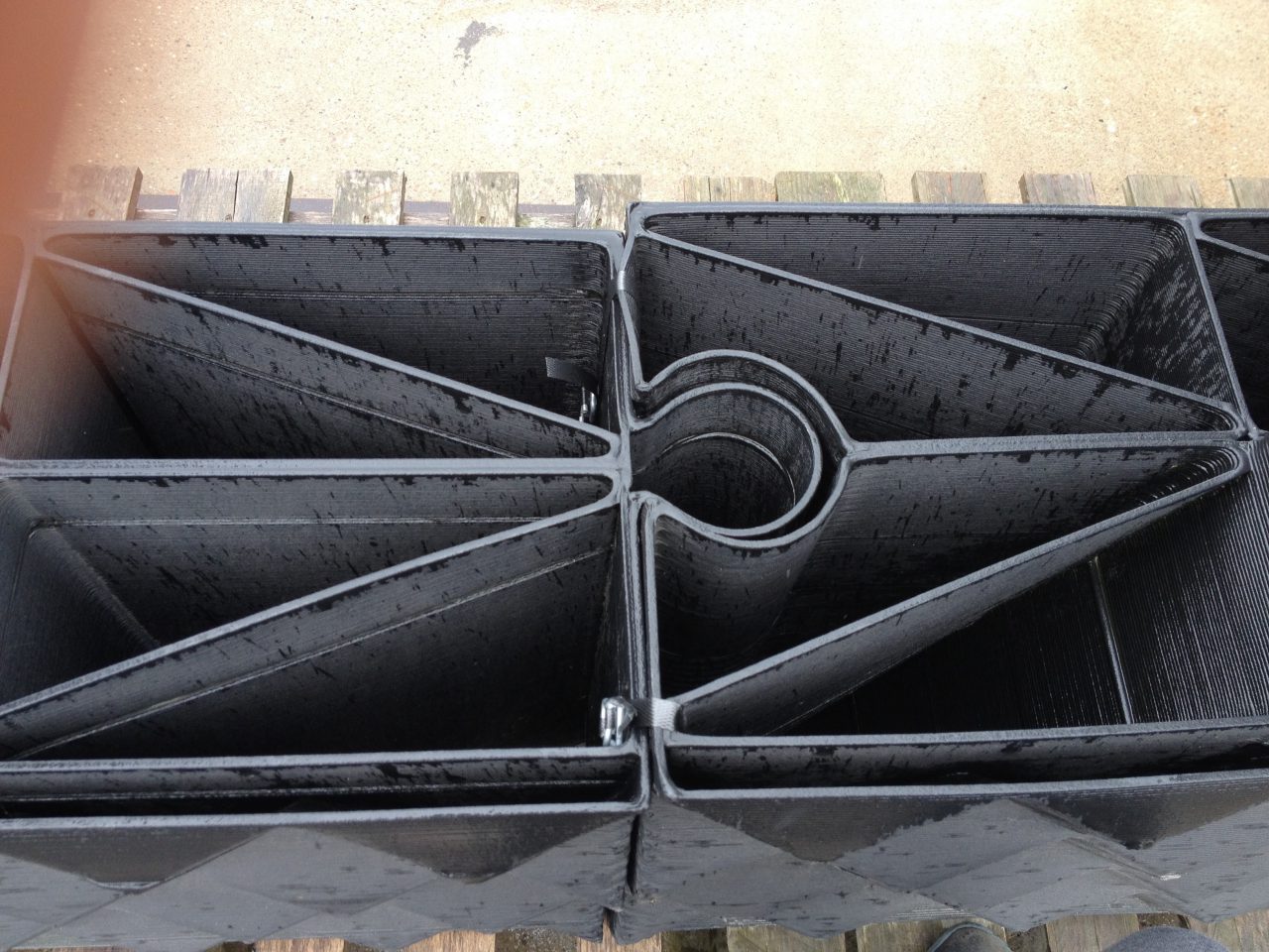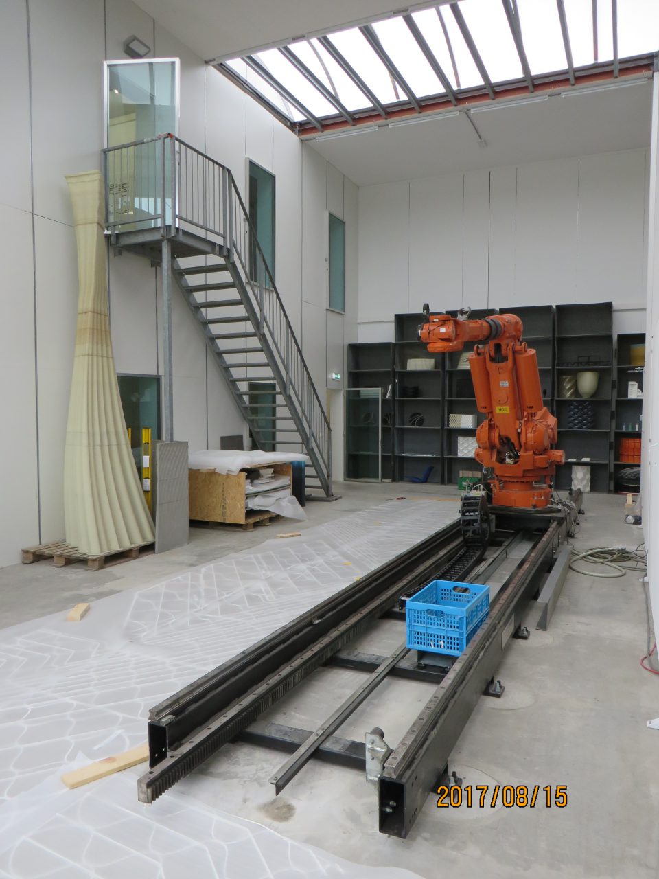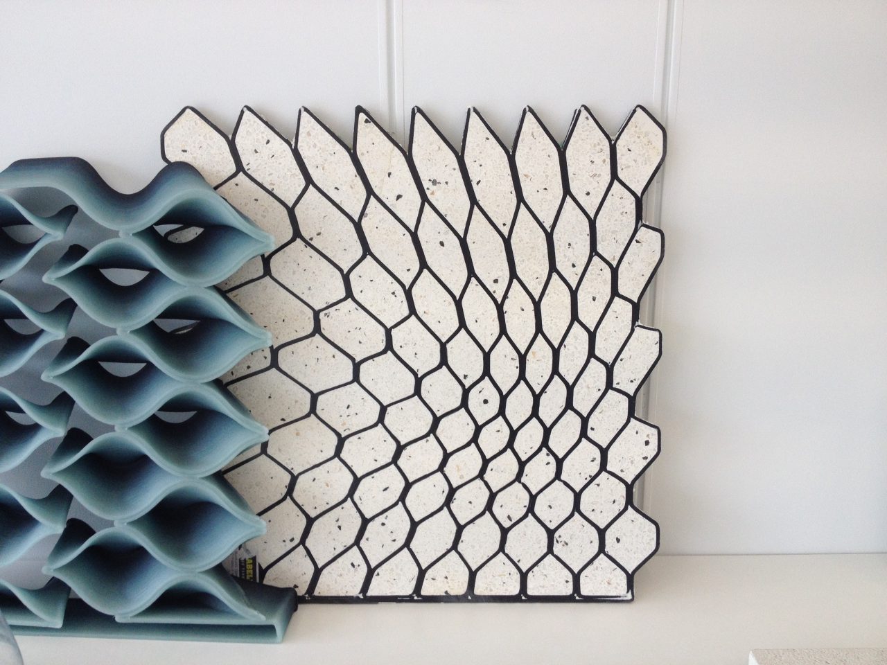 この写真に写っているものは、床材になるもので、(とっても簡単に説明しますと、)フレームになる部分を3Dプリンターで出力し、その後コンクリートを流して固めています。流し込むものは、どんなもの(電気のケーブル、プラスチックの破片などなど)を混ぜたものでも良いらしいのです。