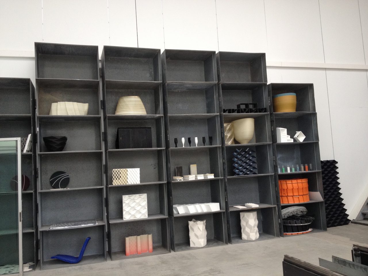 この棚には様々なテストしたものが並んでいます。Hinekenのビールケースを再利用し、フィラメントにしたものものあります。簡単そうですが、安定した、粘着のあるフィラメントを開発するのは長い道のりだそうです。