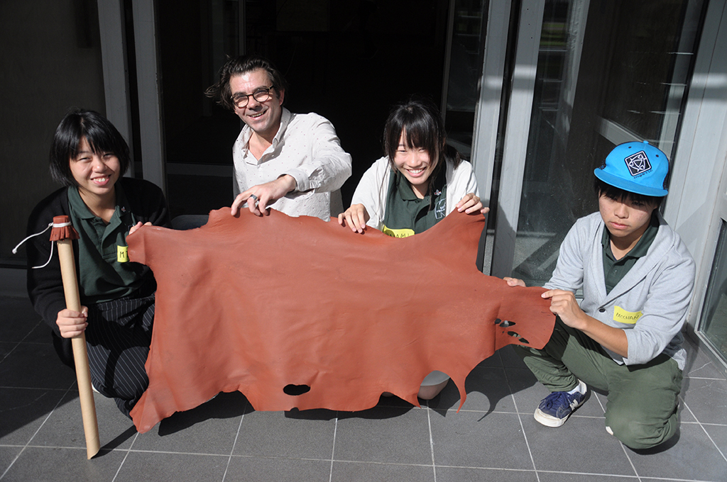 神山チームは、神山杉の板、それから鈴木カバン制作室から譲っていただいた、鹿革を鞣したものを持参。