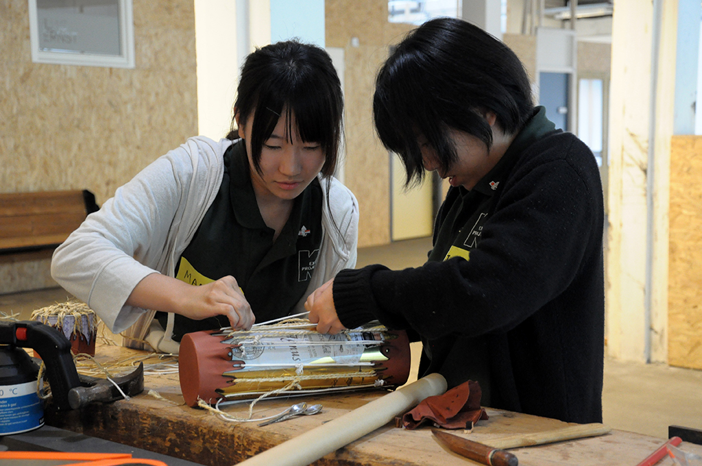 まずは太鼓チーム。鹿の革が厚く柔らかくて、ピンと貼るのが難しい。