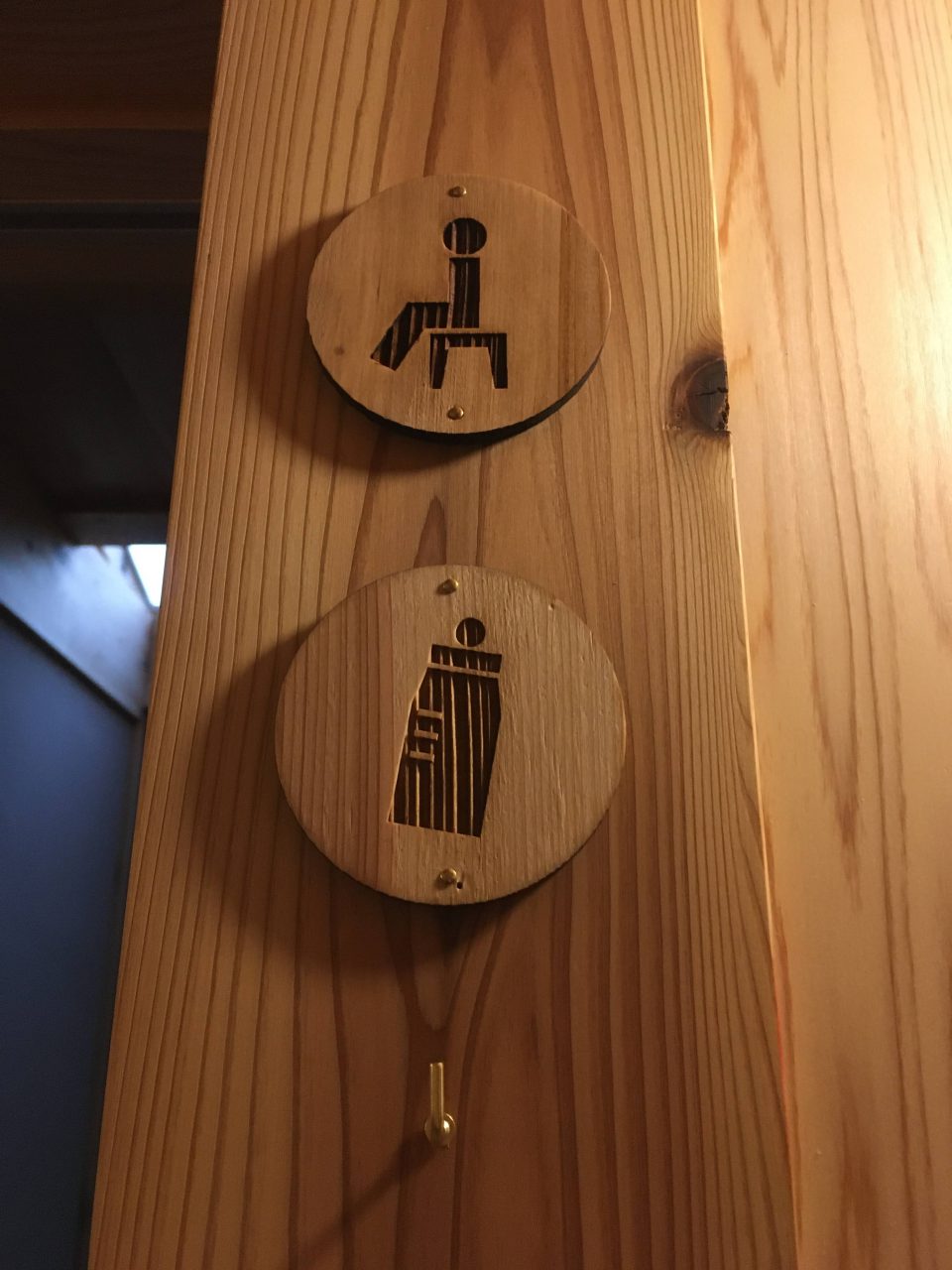 館内は本当に贅沢に杉を使ってあるしつらえで、案内サインもそこへ優しくなじむようシンプルな仕上げでアクセントは真鍮釘。
