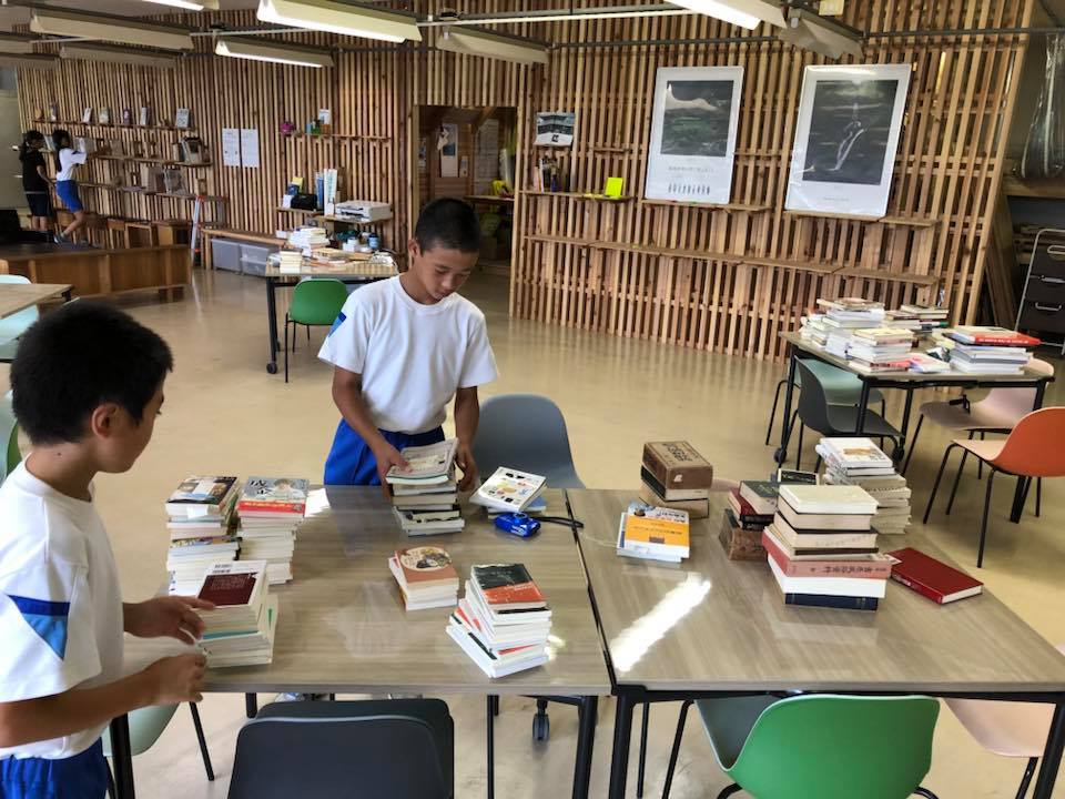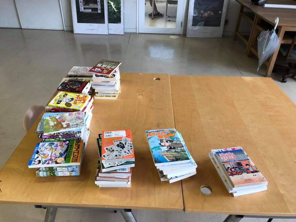 完全に僕の私物なんですが、読書コーナー用に提供しようと持ち込んでいたものです。先日KMSで制作したパーティション棚に並べる仕事を手伝っていただきました。