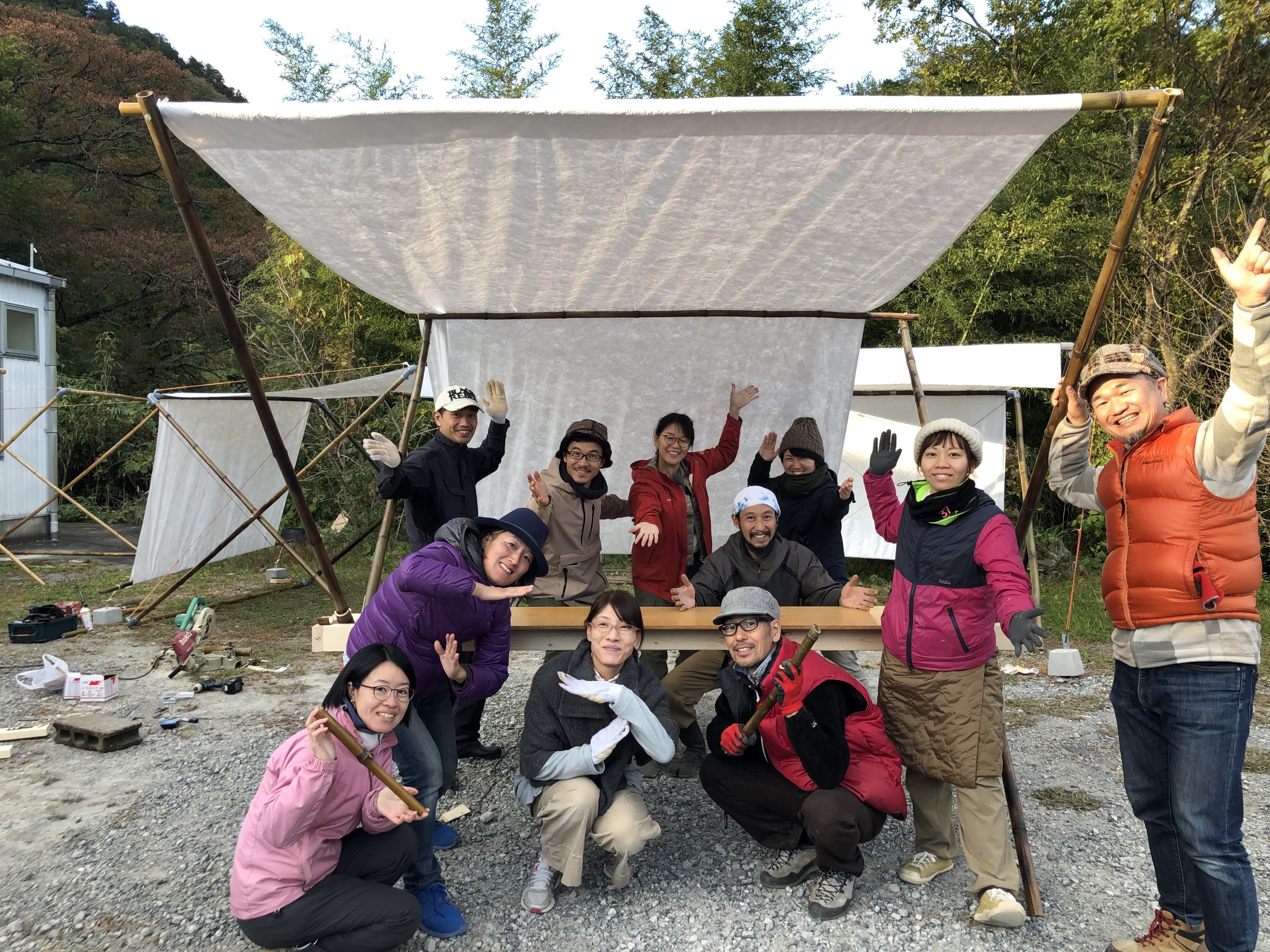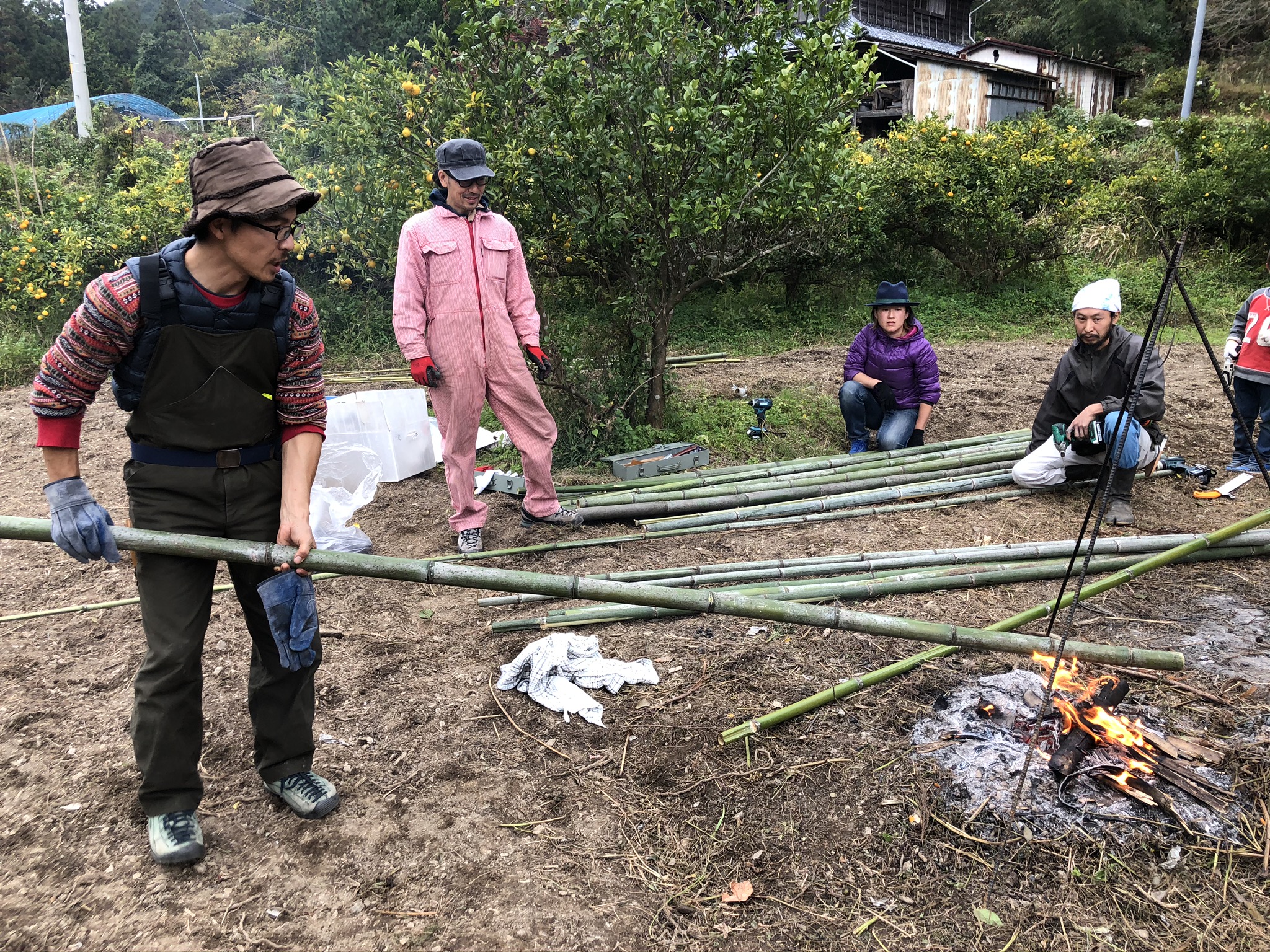 3月に神山に遊びに来ていた南澤さんをご紹介いただき竹テントの存在を知り、竹テントを自分で作れるようになったらこの世のすべてを竹で作れるようになるのではと湧き出る万能感に溺れながら竹の切り旬まで半年以上を待っての開催に至りました。新しいことを始めたくなるときはだいたいこんなノリです。