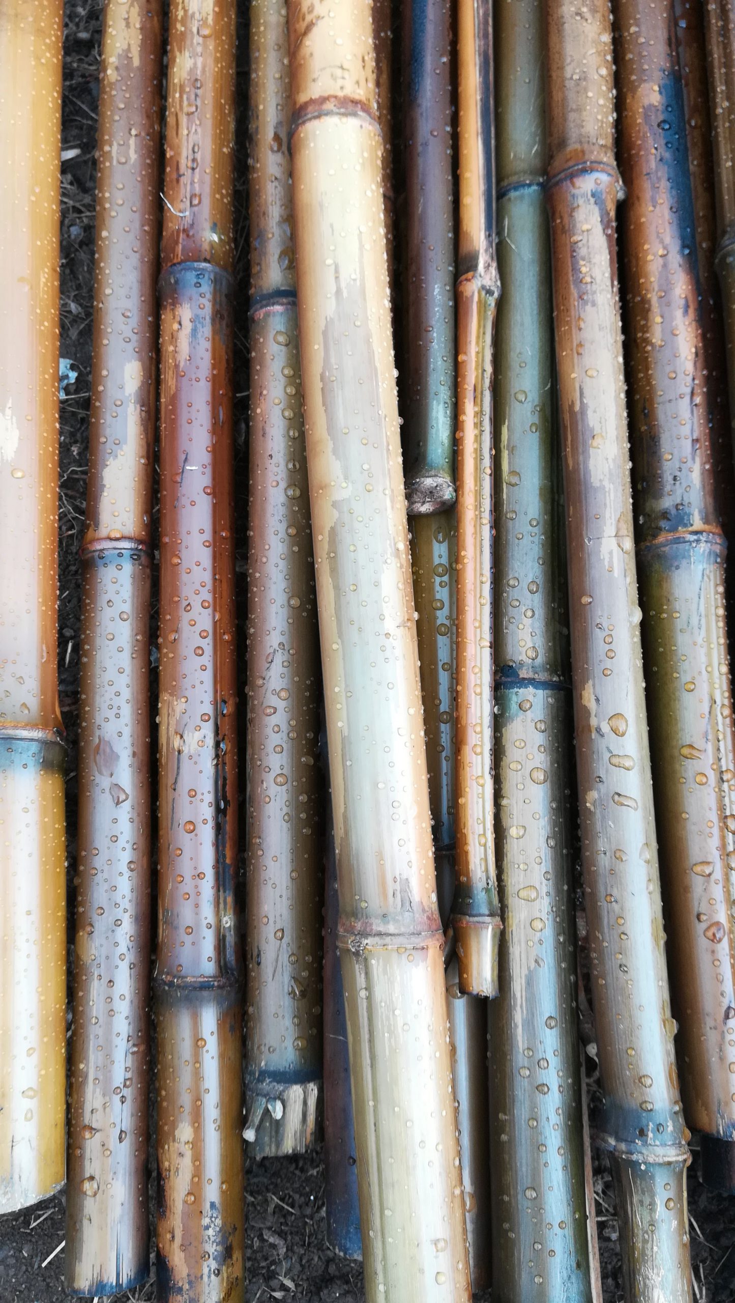 焚き火て青竹を炙るとジュワジュワ油が浮き出して、ウェスで磨くとツヤツヤピカピカ眩しいくらいの金色になれば屋外で雨に晒されても水を弾くし、叩けばカンカン音がするので強度も増しているようです。