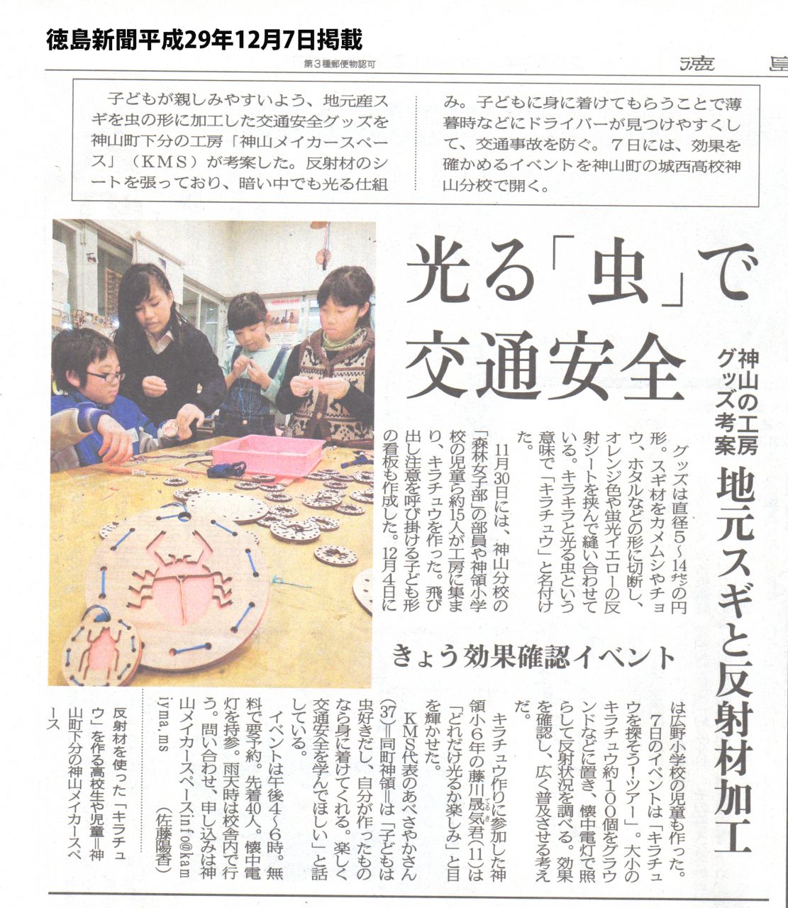 日が落ちるのが早くなり、子供達の学校や塾の帰りなど夕方から夜にかけて歩行者が車から見えにくくなる時間がぐんと増ええてきます。神山メイカースペース(KMS)では、子供達と一緒に楽しく交通安全について体験できる「キラチュウを探そう!」ツアーをおもいやりライト事務局と城西高校の協力により実現しました。