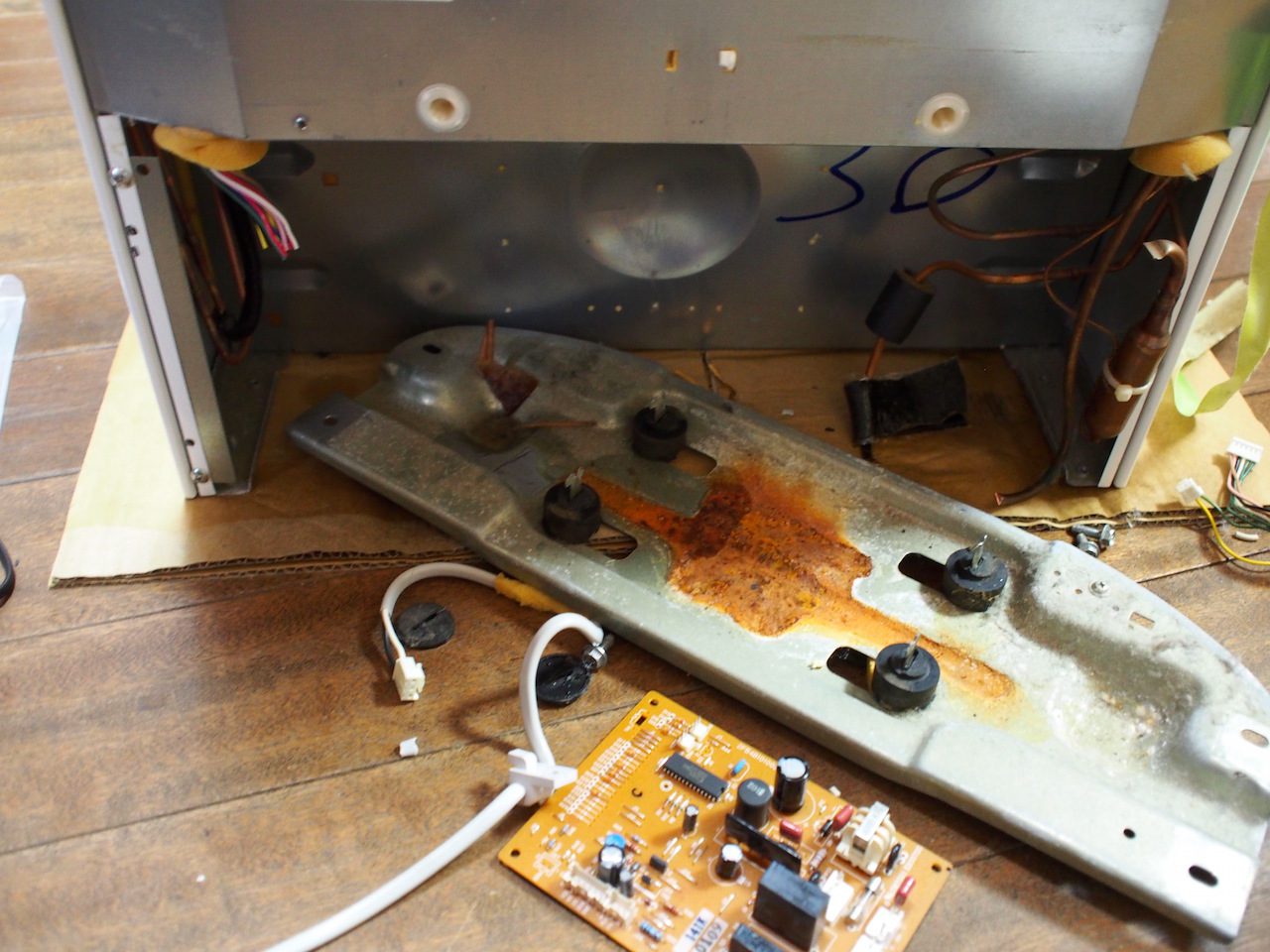 コンプレッサは冷蔵庫の後ろの一番下にありました。真鍮の管は10cm程度残してニッパーで切ってしまってOK. 電線は配線図を見て、運転コンデンサと基盤の間で切ります。