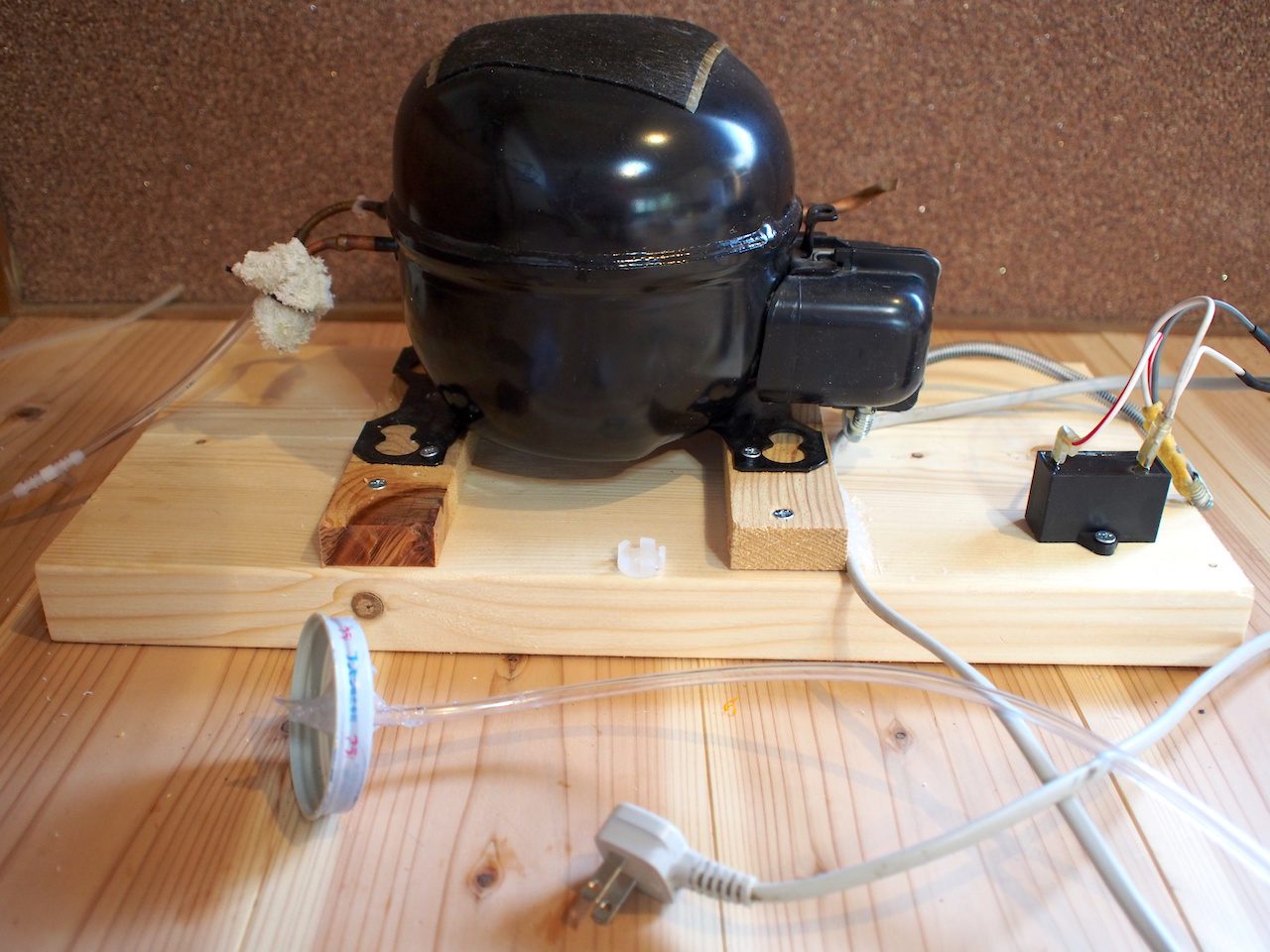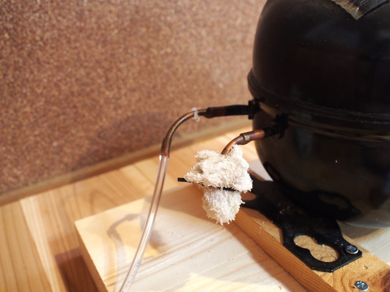 ちょうど家に使っていない冷蔵庫があったので、コンプレッサを取り外して、真空脱泡の実験をしてみました。