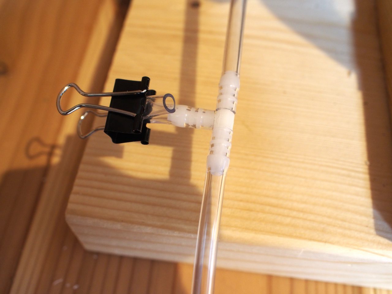 プレッシャーリリースは、継手から出したビニール管を折り曲げるというすごく雑な機構にしています。先のリンク先ではペットボトルのキャップを使ったものを作っていて、かっこいいです。