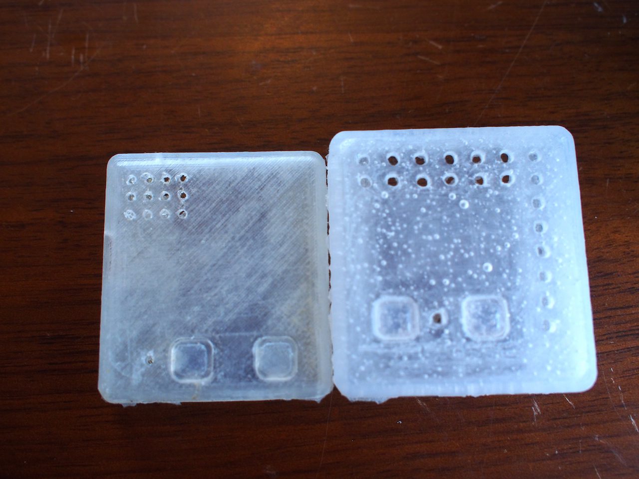 下の写真左がこの真空脱泡機で脱泡後硬化させたもの。右は真空おひつで頑張ったけど抜ききれなかったもの。色味とテクスチャの違いは型が違うので無視してください。